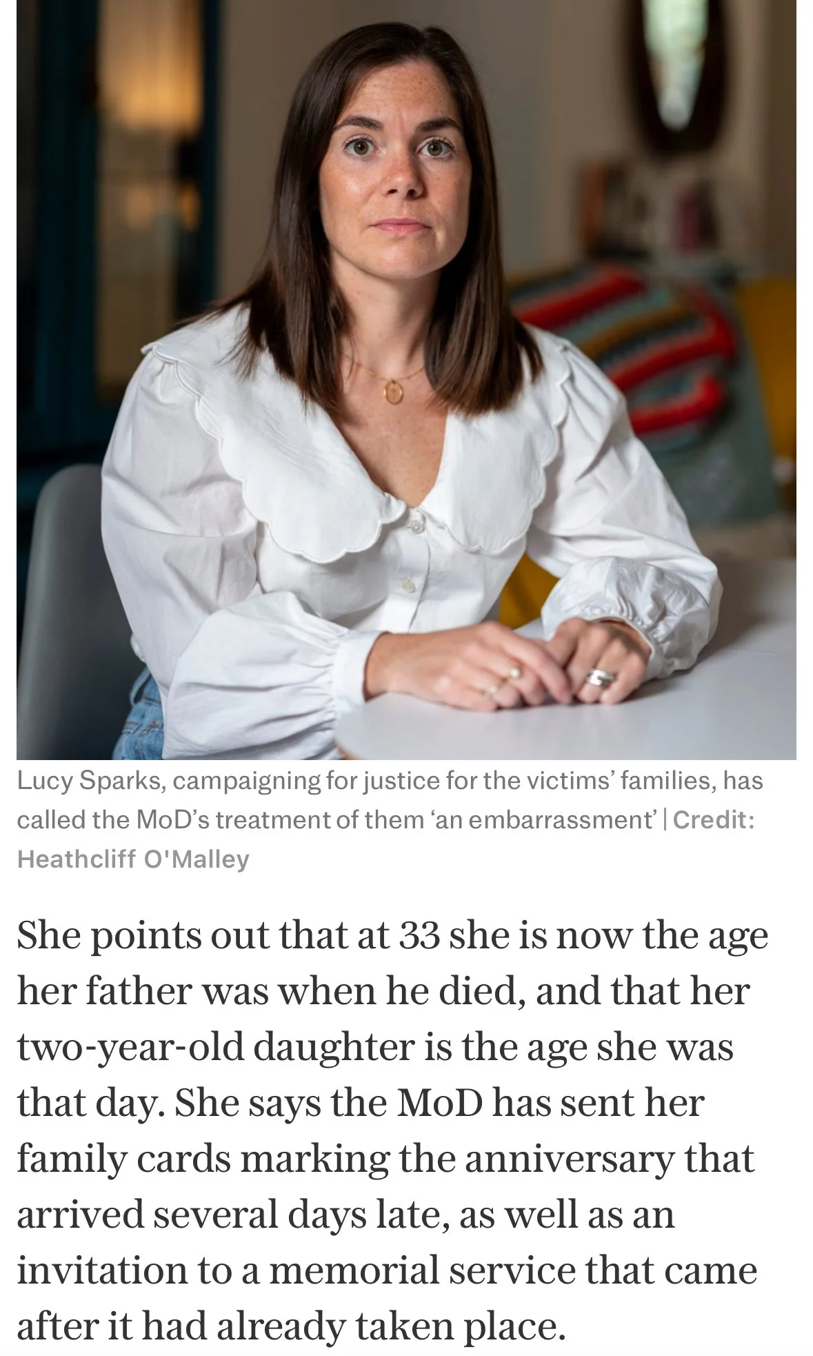“I think we’ve been deceived and lied to,” says Lucy Sparks, who was two when her father, Major Gary Sparks of the Royal Artillery, was killed.