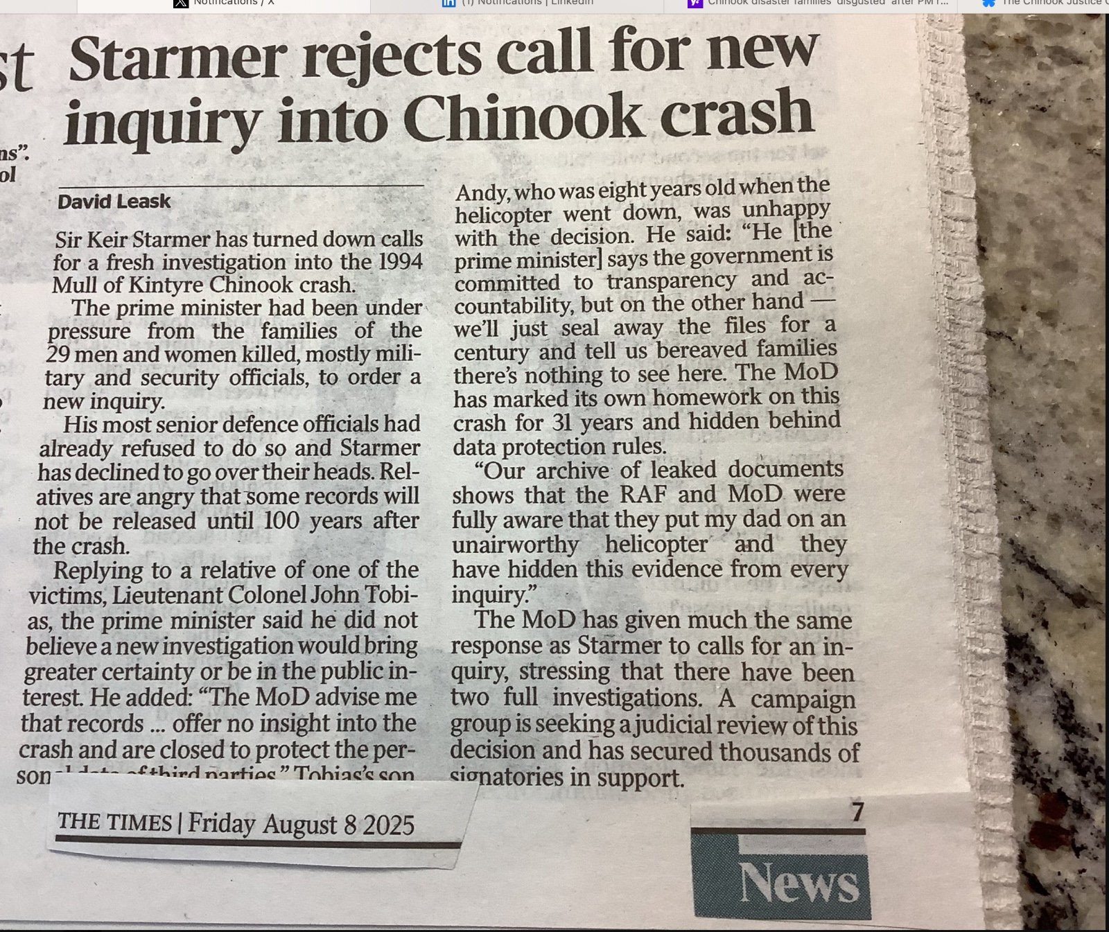 We also learned that the crucial documentary by Fine Point Films for the BBC, which first revealed that the files on the 1994 Mull of Kintyre RAF Chinook crash were locked away for 100 years, is being re-broadcast on Sunday 16th and Sunday 24th August on BB2 at 9pm. Read about that here on News from Scotland.